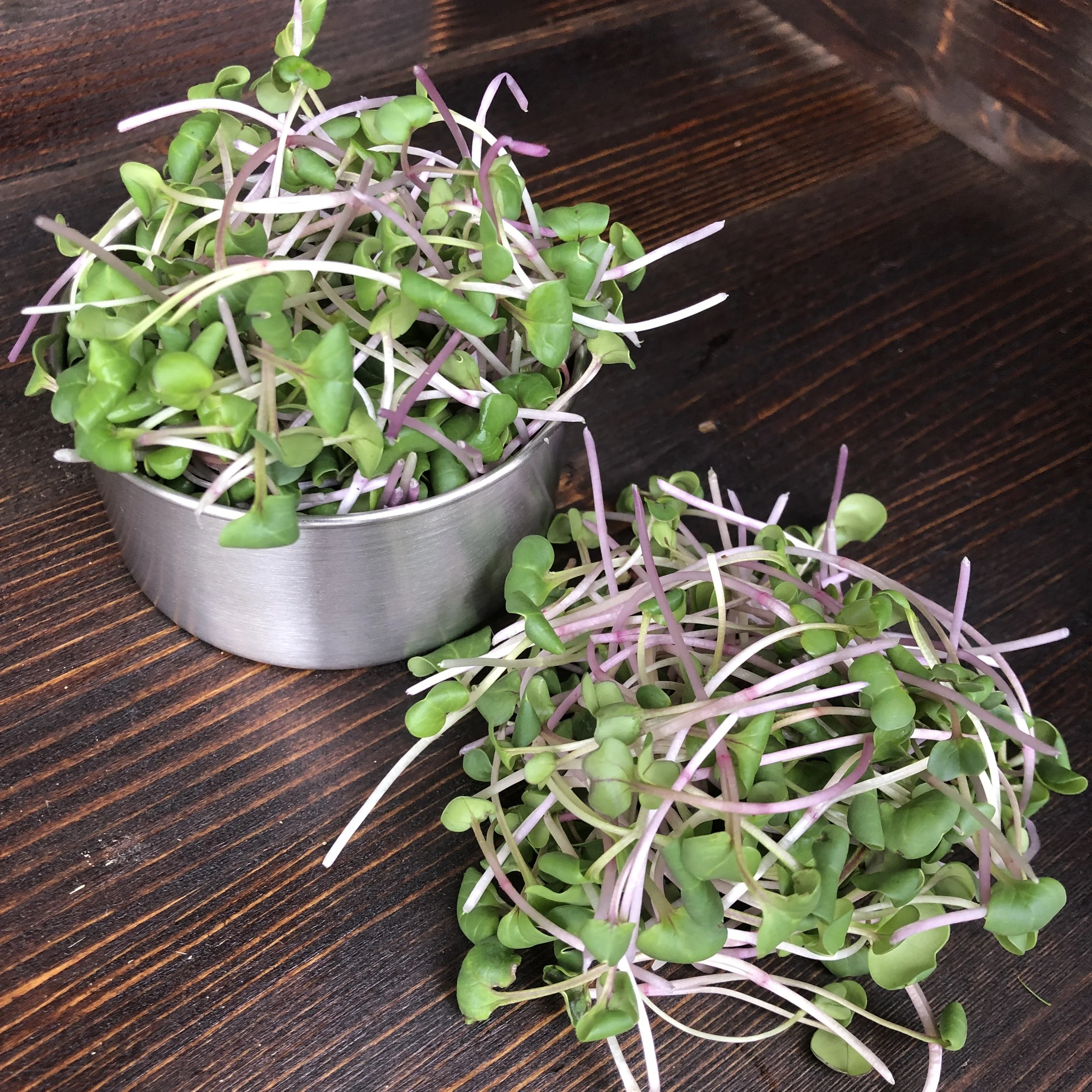 A little radish spice in a pink and green shoot - these greens have a little spice to them but are super delicate and fine greens. They are perfect on tacos, fish dishes, on eggs, or to add a little zest to your sandwich or salad.